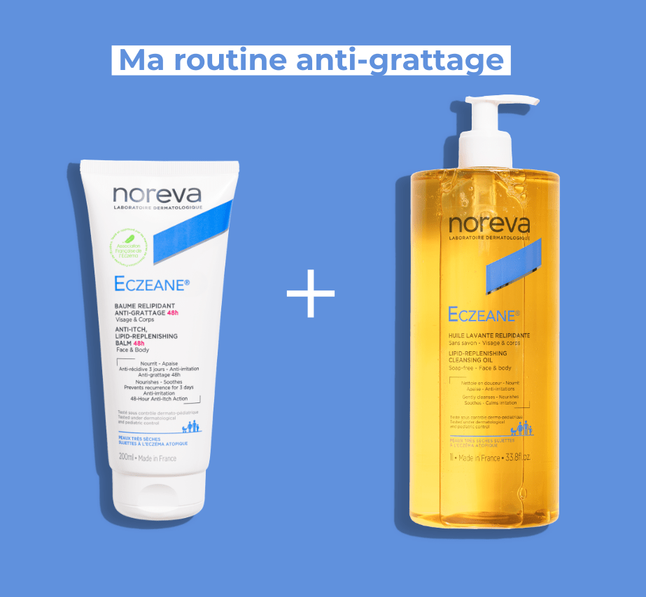 Spécifiquement formulé par nos dermatologues, Noreva vous propose la routine indispensable pour les peaux très sèches à tendance atopique. Ce duo agit en synergie pour stopper le cercle vicieux du grattage et restaurer la barrière cutanée des petits et des grands.