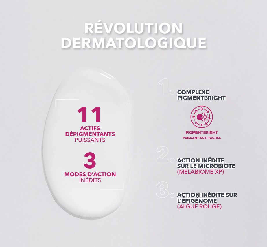 PigmentBright® est composé d’actifs puissants qui agissent à 6 niveaux de la production de mélanine. La formule intègre aussi deux modes d’action inédits, basés sur les dernières avancées scientifiques : (1) action sur le microbiote cutané et (2) action épigénétique contre les taches