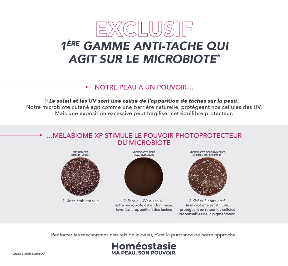 La peau a un pouvoir : notre microbiote protège notre peau et nos cellules des UVs. Melabiome XP stimule la fonction photo-protectrice naturelle du microbiote, renforçant la défense de la peau contre le soleil, facteur d'apparition des taches.