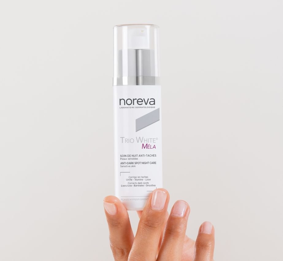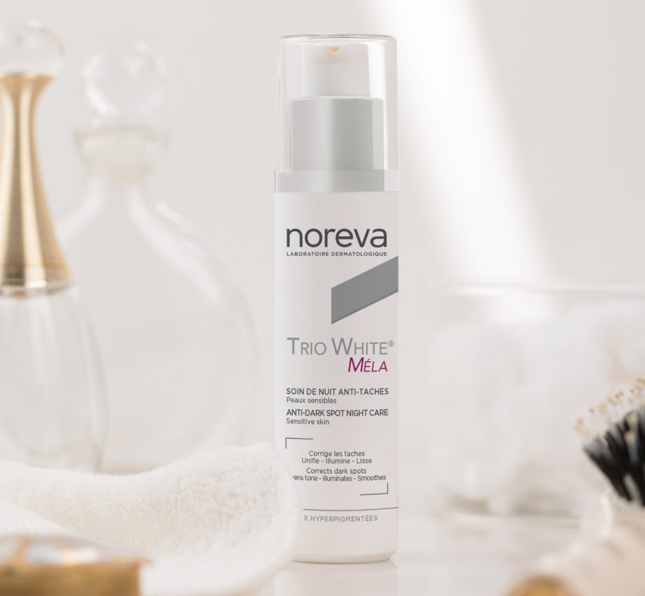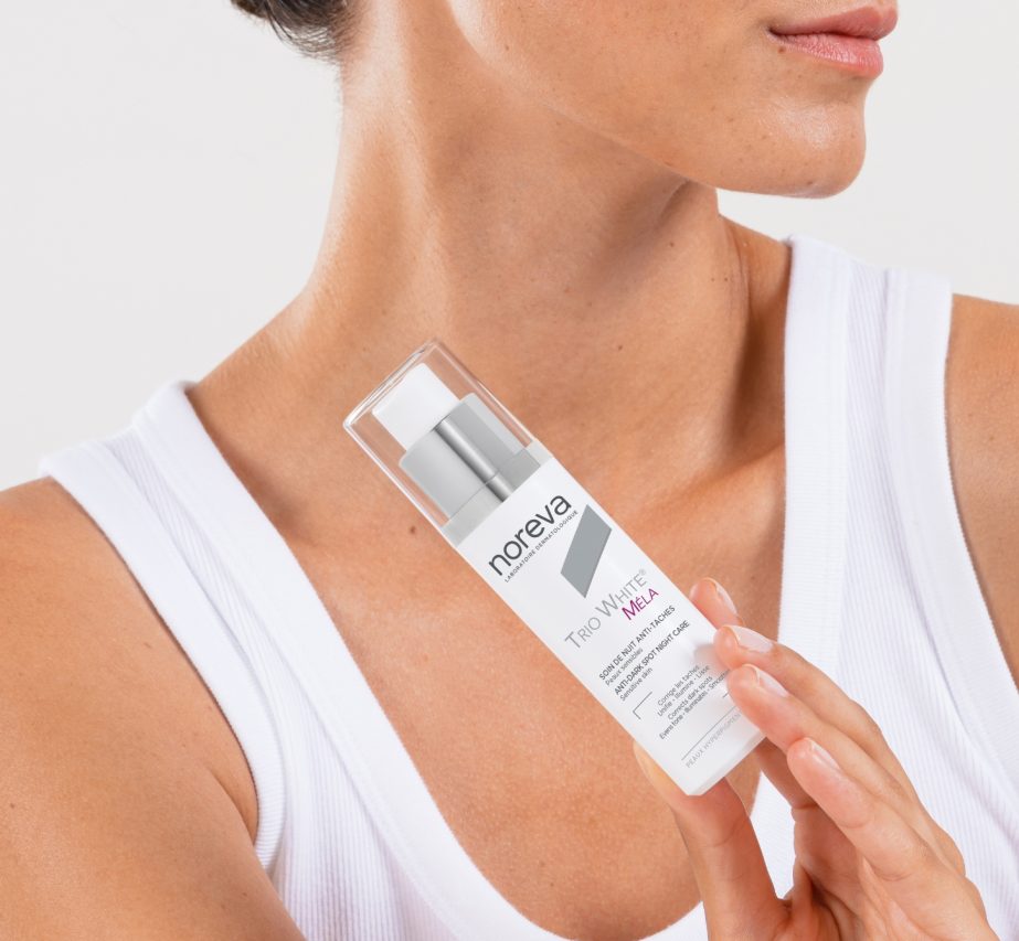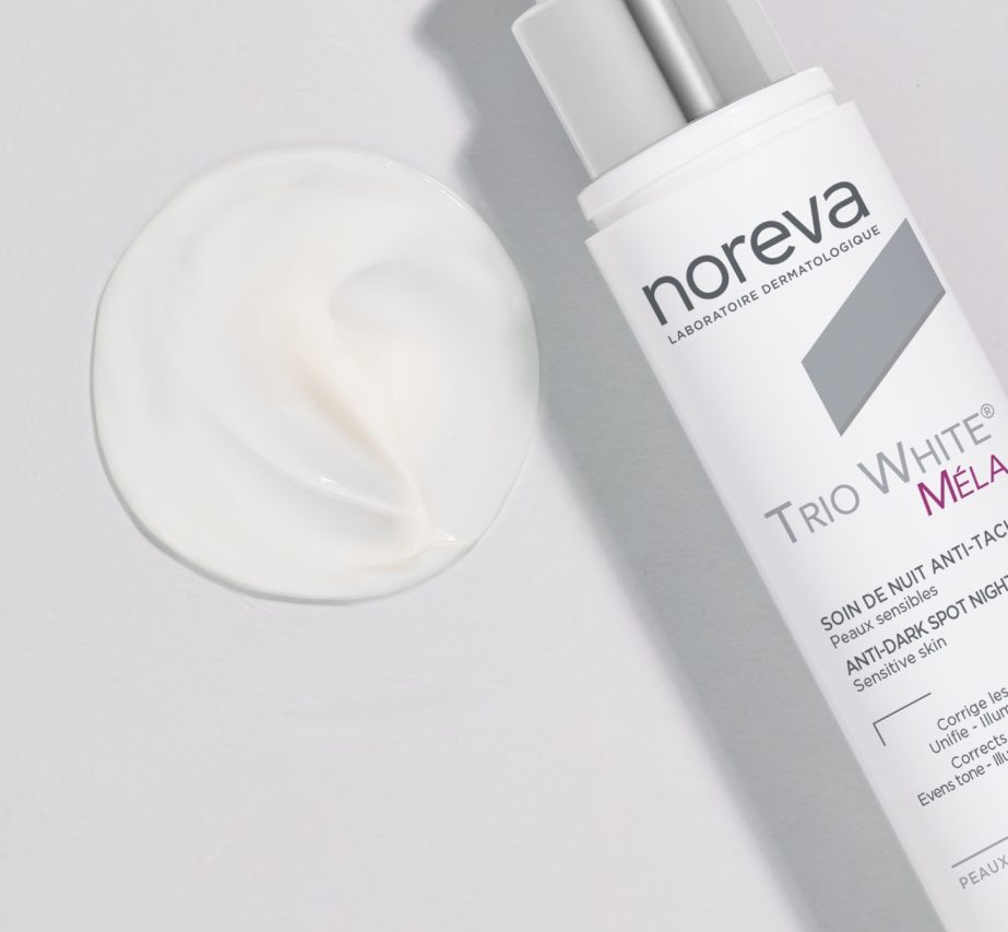 Trio White® MELA Soin de nuit anti-taches offre une formule unique avec deux modes d’action inédits : l’algue rouge agit sur l’épigénome du mélanocyte pour freiner l’activité des gènes responsables des taches, tandis que notre complexe exclusif PigmentBright combine six actifs ciblés qui bloquent six étapes clés de la mélanogenèse afin de limiter la formation de nouvelles taches et atténuer celles déjà visibles.